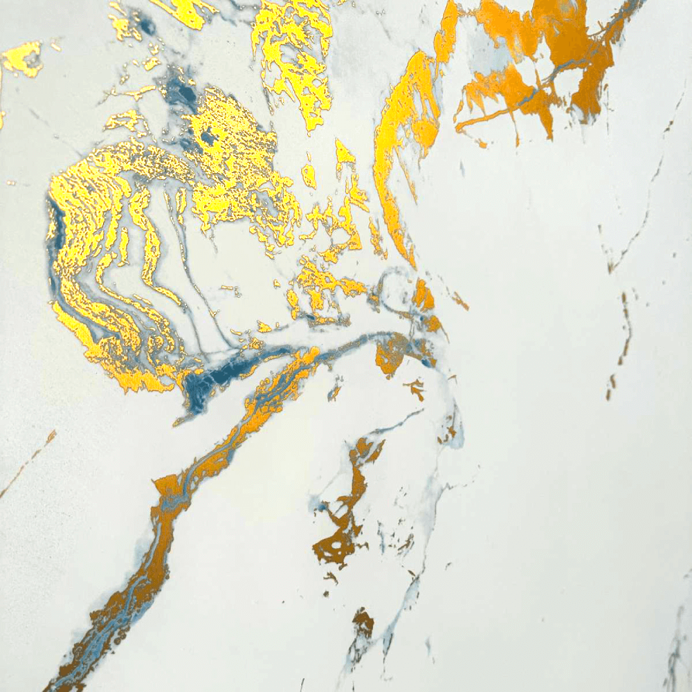 Con una impresionante combinación de vetas doradas, tonos azul océano profundos y suaves matices blanco mármol, este panel irradia la elegancia del mármol natural de lujo, sin el mantenimiento ni el costo del material real.